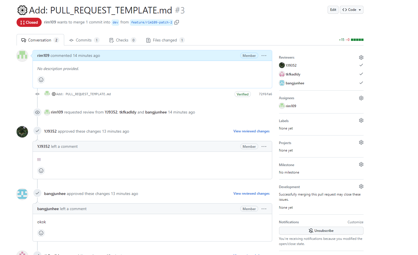 위 사진을 보면 팀원 3명이 전부 리뷰를 완료한 상태다.