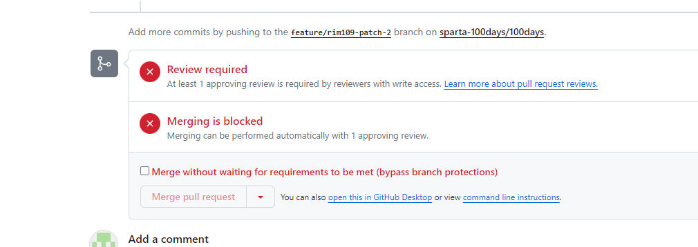 즉 저장소에 대한 쓰기 액세스 권한이 있는 검토자로부터 최소 하나의 검토가 필요하다는 말이였다.